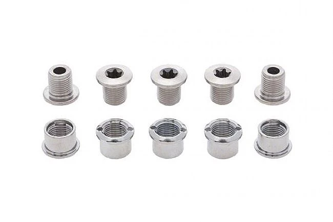 The Shimano FC-5700 Gear Fixing Bolt & Nut (5 Sets) include Shimano Chainring Bolts made of steel with T-30 Torx head.